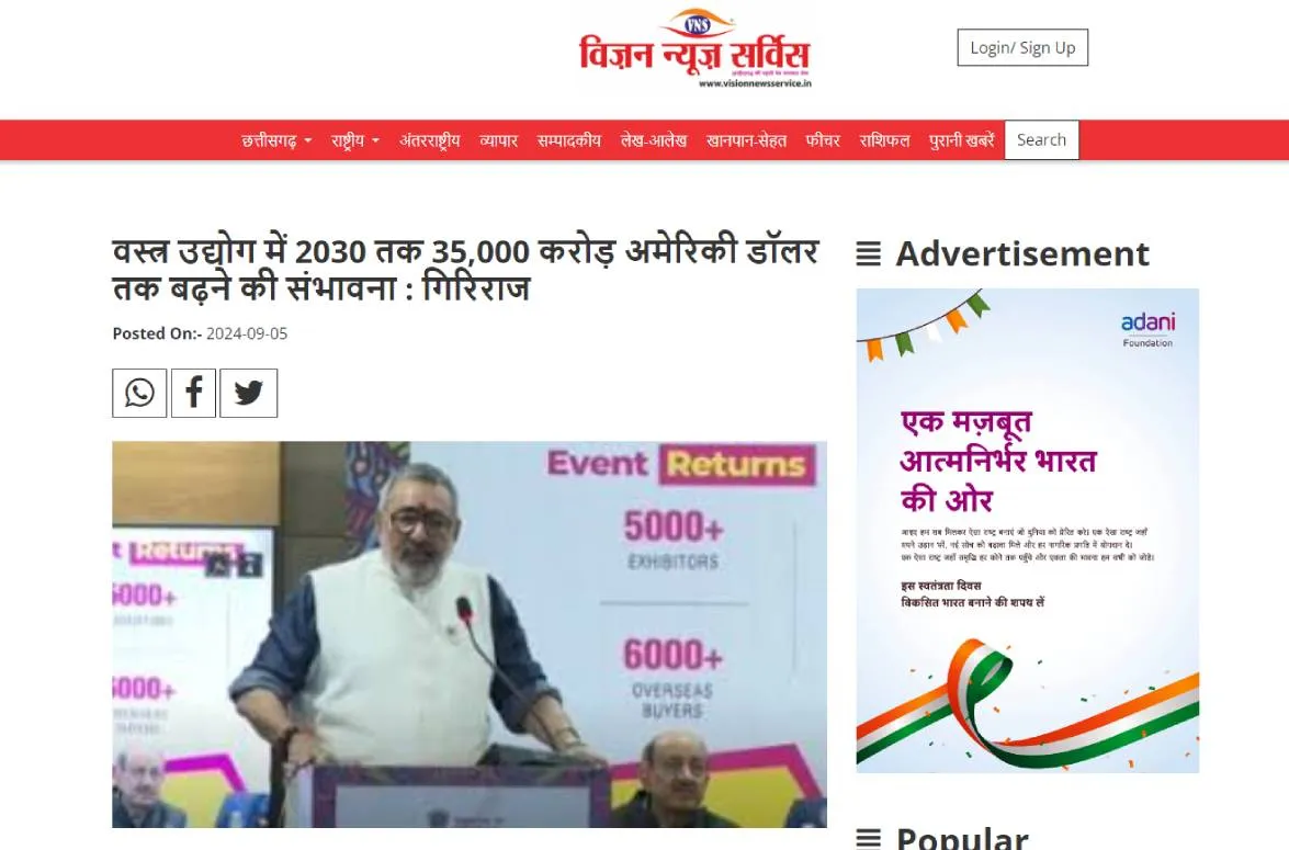 वस्त्र उद्योग में 2030 तक 35,000 करोड़ अमेरिकी डॉलर तक बढ़ने की संभावना : गिरिराज (visionnewsservice.in)