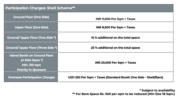 - Island Booth (Ground Floor Only) – 4 Side Open – Min 150 Sqm and above (Priority to to sponsors) : INR 20,000 Per Sqm + Taxes